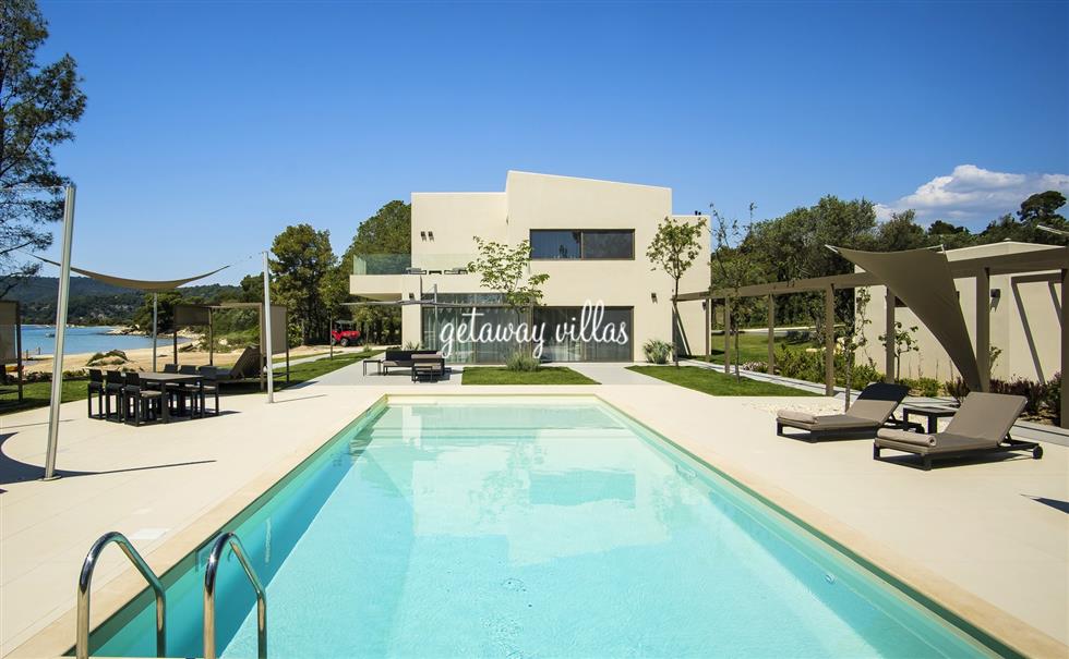 Lagoon villa is an elite, seafront, holiday villa for rent on the island of Diaporos, Halkidiki, Greece. This luxury secluded villa offers 3 bedrooms (sleeps 6) and has a large private infinity pool. Comfort, luxury and attention to detail are key at Lagoon villa which sits in beautiful landscaped grounds which meander to your private jetty and sandy cove. Architect designed in a clean contemporary style and fully equipped and furnished to a very high standard this island residence is a wonderful holiday home perfect for the idyllic getaway. The island of Diaporos is in an eco-paradise on the second of three peninsulas of Halkidiki in the Northern Agean sea and is surrounded by sandy white beaches and calm turquoise waters. Included is complimentary 5m 30hp engine boat at your disposal to explore plus butler, daily maid service and transfers.